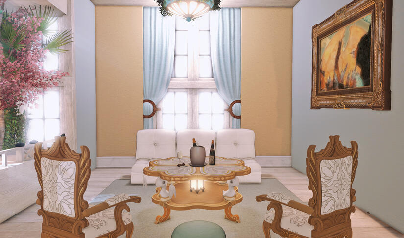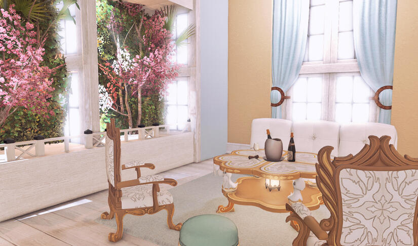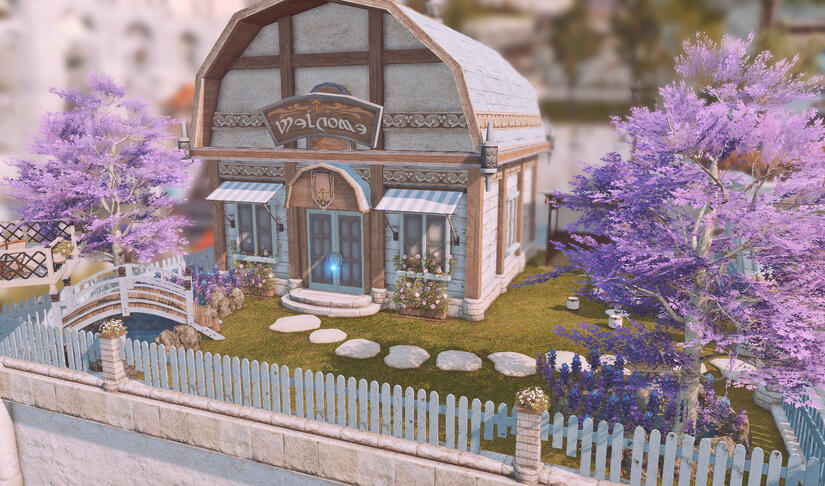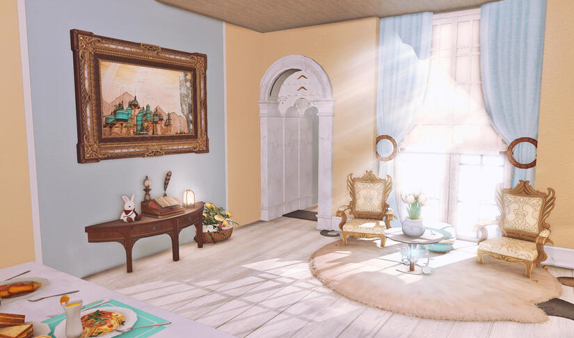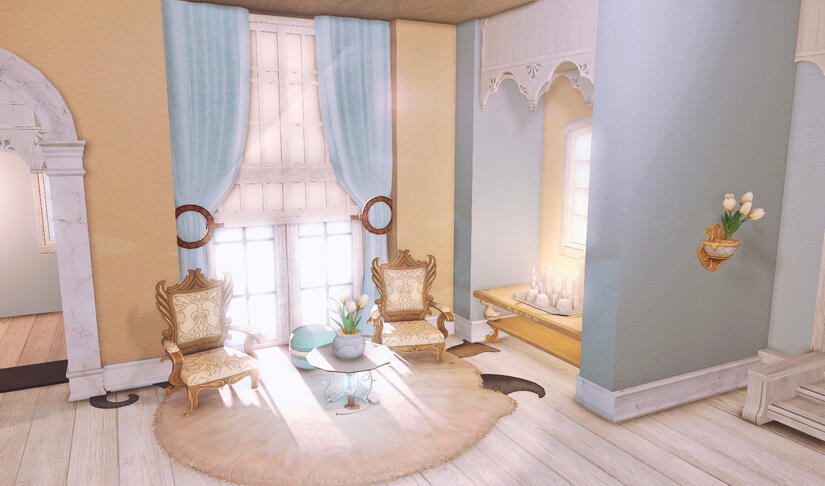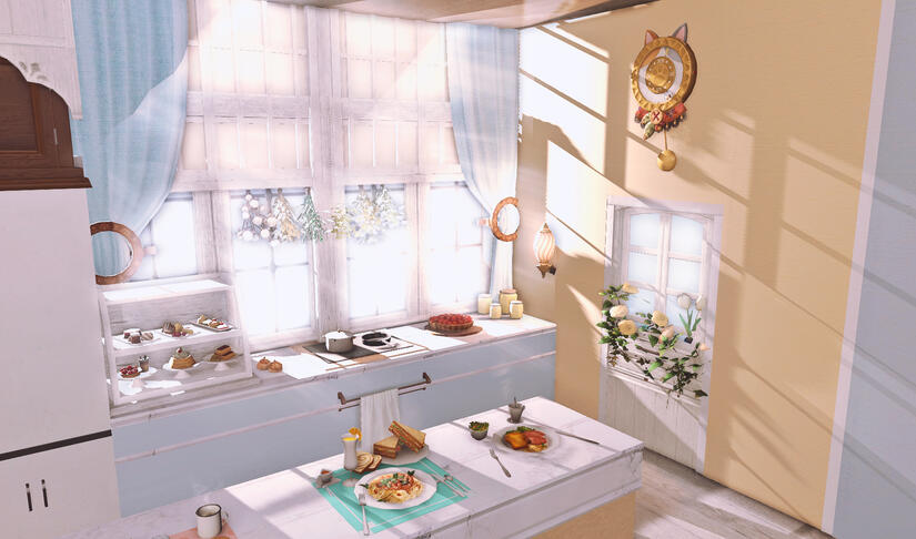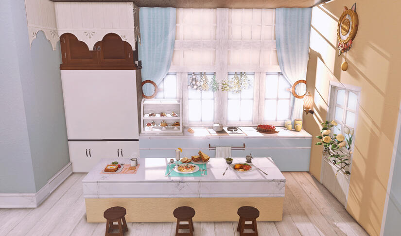 Primal | Lamia | Mist | Ward 21, Plot 25I've always loved the combination of light blue and yellow, and saw a great opportunity to make a home with these colors for this FC house that I designed. This home features a cafe-like kitchen with pastries and lunch sets, a sweet floral door leading to more rooms, cute and cozy details, and a couple of lounging areas to seat friends and guests.